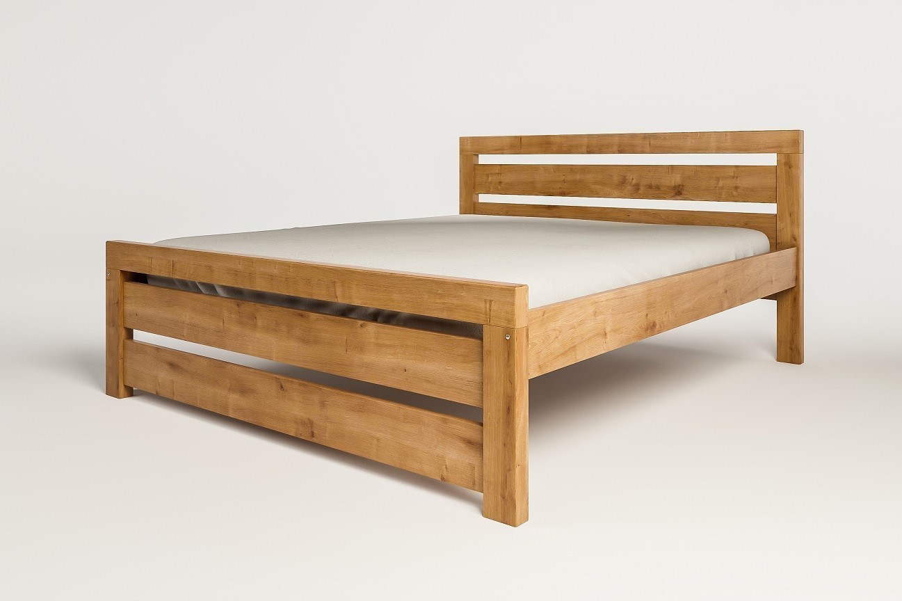 Masívna drevená posteľ v hnedom prevedení.