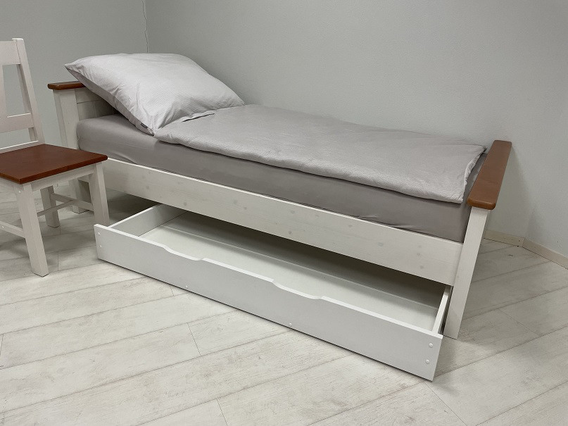 Drevená zásuvka na kolieskach vhodná pod biele postele Gazel so štandardnou výškou.