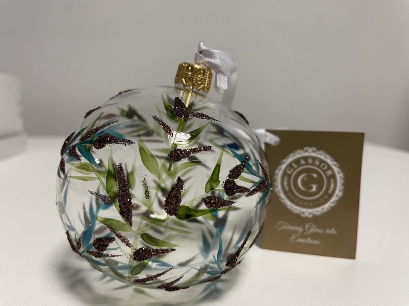 Skleněná vánoční baňka čirá se zeleno-hnědými větvičkami je velká 8 cm.